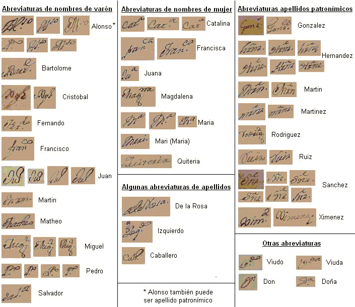 Las siguientes imágenes corresponden a abreviaturas de nombres y apellidos, existentes en libros parroquiales de mediados del siglo XVIII de Castillo de Locubin, en la provincia de Jaén, España, que nos pueden orientar para la interpretación de partidas y documentos en otros países de habla hispana, sobre todo.